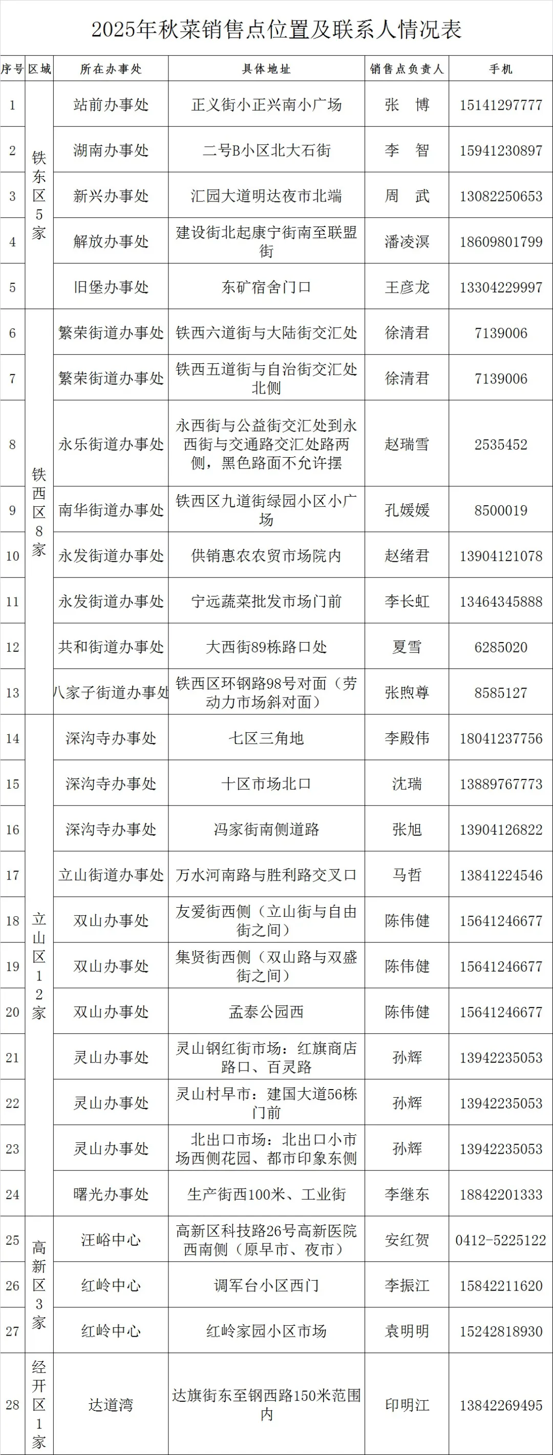 为有效促进秋菜销售,满足市民生活需求,同时保障菜农合法权益,鞍山市依托现有农副产品交易市场、农贸市场、农产品超市设立了秋菜临时集中销售点。以各街道办事处为单位,根据实际情况,充分利用闲置空地,设置秋菜临时集中销售点28个,其中:铁东区5个、铁西区8个、立山区11个、高新区3个,经开区1个,方便菜农就近销售、市民就近采购。