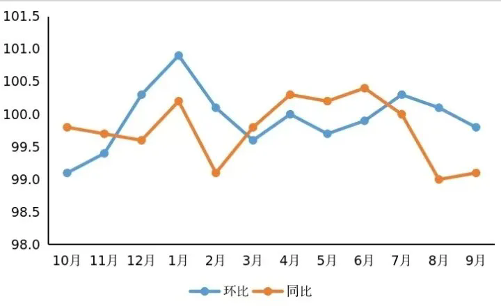 与2024年9月相比,八大类商品及服务价格呈现“三升四降一平”态势。其中,其他用品及服务、衣着和生活用品及服务价格分别上涨9.6%、1.4%和1.3%;交通通信、食品烟酒、医疗保健和教育文化娱乐价格分别下降4.0%、2.9%、0.5%和0.4%;居住价格持平。