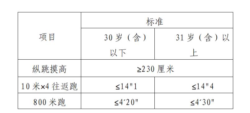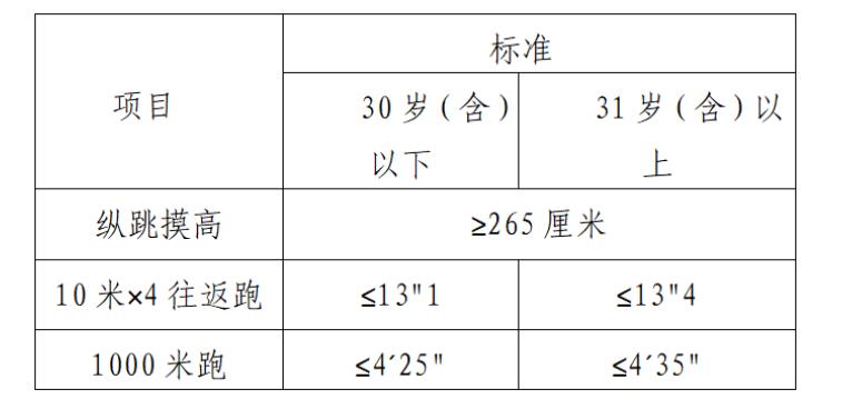 体能测试项目包括纵跳摸高、10米×4往返跑、男子1000米跑和女子800米跑,凡应测项目中任意一项不达标的,即为体能测试不合格。