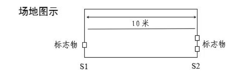 受测试人员采用站立式起跑,听到发令后从S1线外跑到S2线前(脚不得踩线)用手将竖立的木块推倒后折返,往返跑2次,每次推倒1个木块,第2次返回时冲出S1线。按组别进行测试,每人最多可测2次,1次测试达标,即视为该项目测试合格。