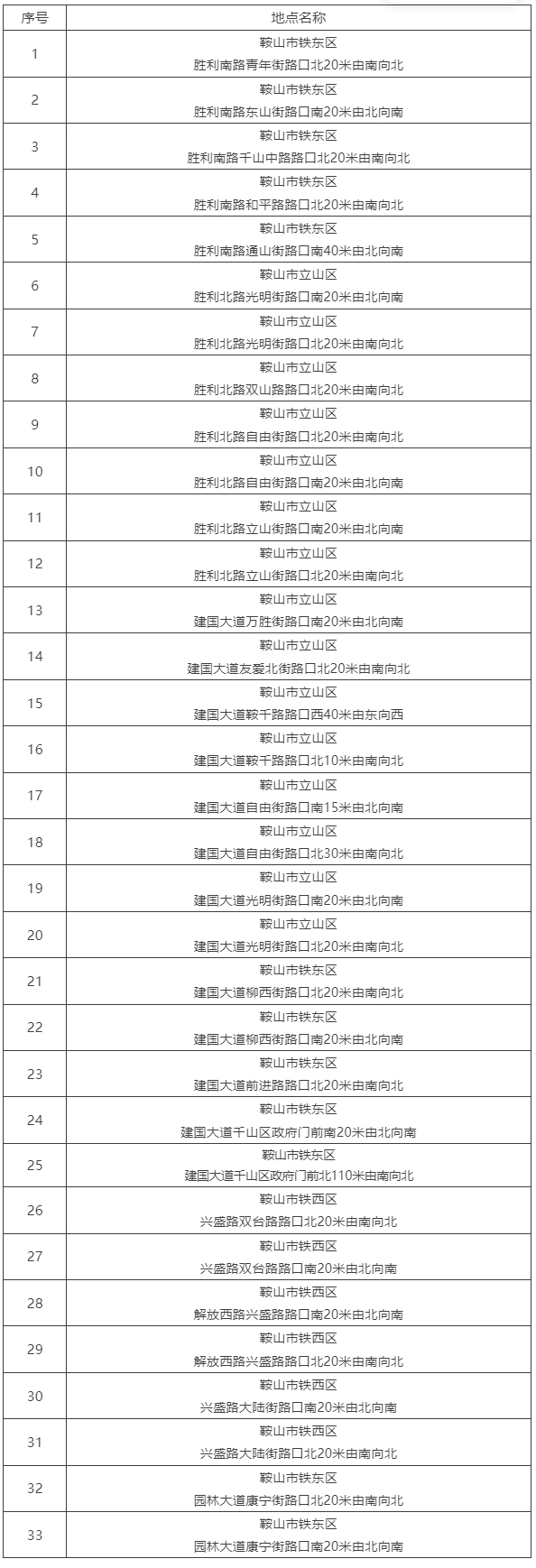 根据道路交通安全管理需要,按照《中华人民共和国行政处罚法》《中华人民共和国道路交通安全法》等法律法规有关要求,现对鞍山市部分固定式交通技术监控设备点位向社会公布,提醒广大驾驶人依法行车,安全驾驶。