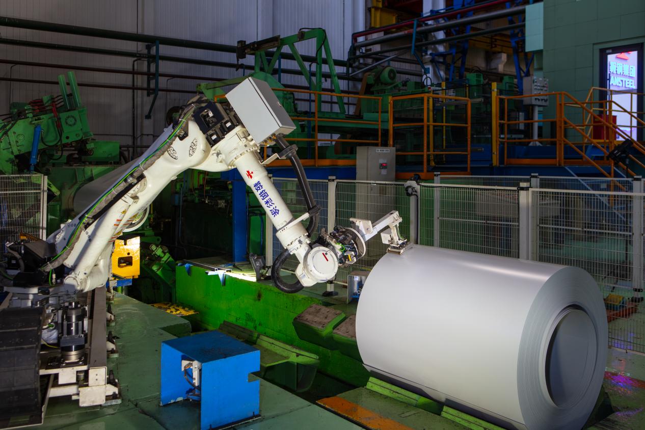 走进车间,高端彩涂板生产线正在精准运作。据工人介绍,产线依托集控中心和机器人应用实现了生产过程的数字化与智能化,其生产的产品已应用于北京大兴机场、雄安新区等国内外重大工程项目。