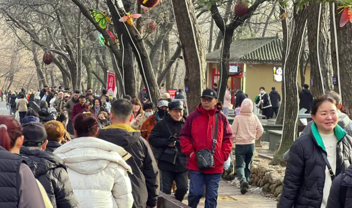 千山景区初四至初五通宵营业,游客源源不断涌入,人气持续攀升。景区停车场早早爆满,千山东路上车流绵延不绝,道路两侧停满了各地牌照的车辆,处处都是共赴新春迎好运的热闹景象。景区游客中心、电瓶车站排起了长龙,正门广场人头攒动,热闹非凡。