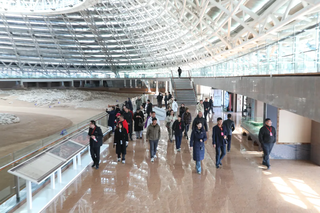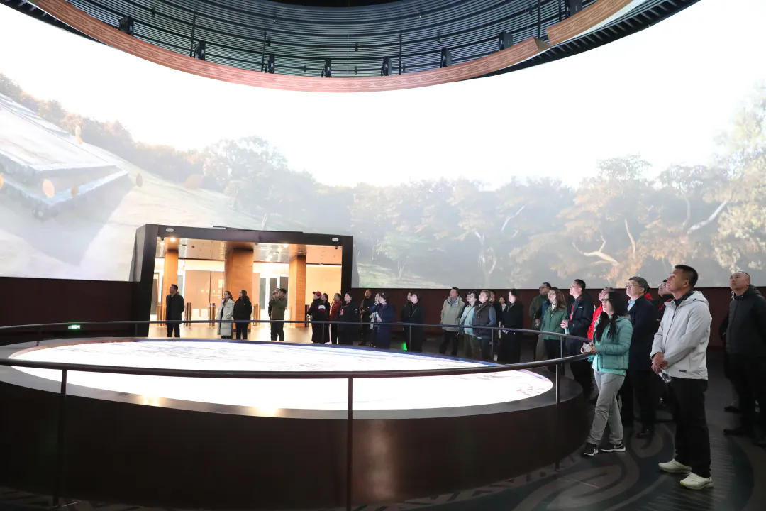 嘉宾们相继走进苏秉琦纪念馆、牛河梁遗址博物馆、第一地点(女神庙)保护展示馆、第二地点(积石冢、祭坛)保护展示馆,沿着精心规划的参观路线有序前行,认真聆听讲解员对遗址背景、出土文物及文化内涵的详细介绍,并不时驻足仔细观察文物。在牛河梁遗址博物馆序厅,360°投影生动展现红山先民的生产生活和祭祀场景,科技感十足。在“红山古国”“文明发端”等主题展厅,大家纷纷驻足凝视红山女神头像、玉猪龙、勾云形玉佩等珍贵文物,不禁为红山先民的文明和智慧发出感叹。