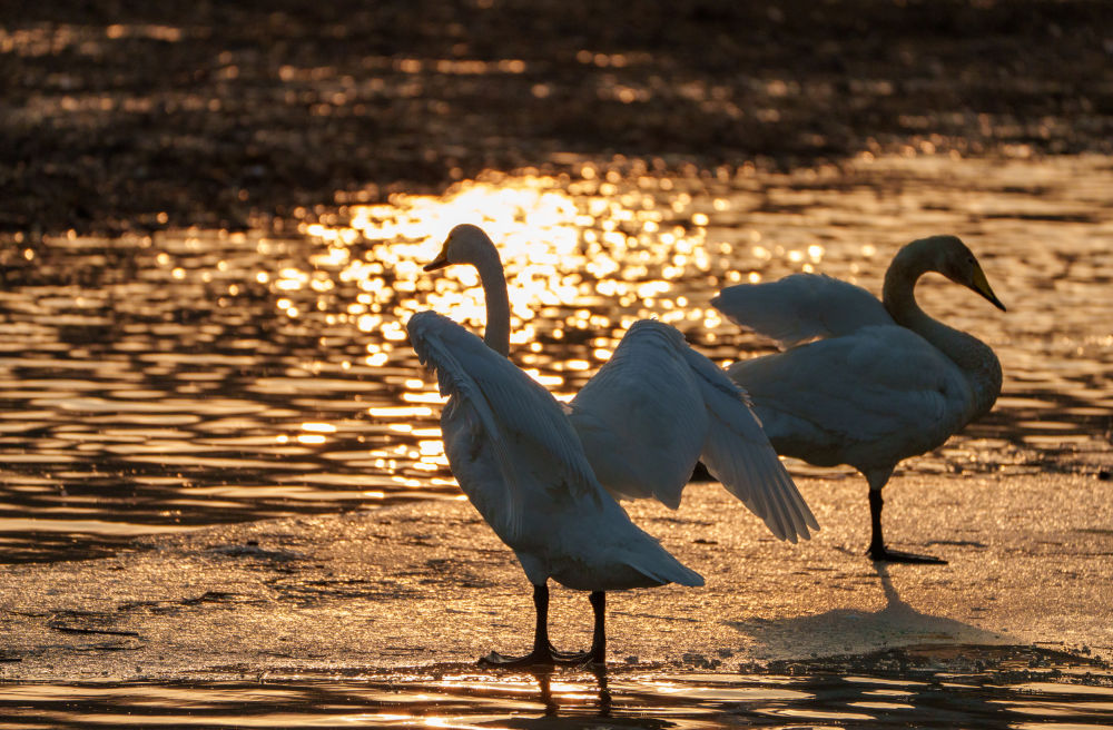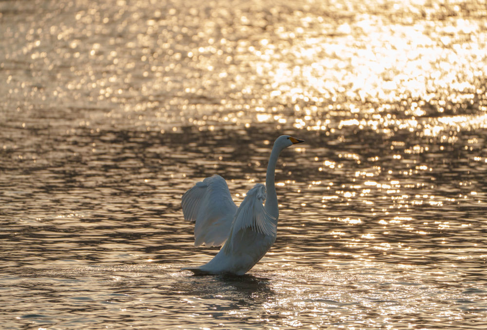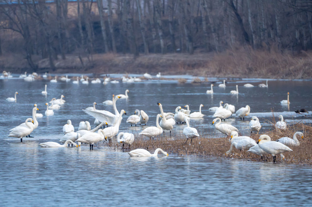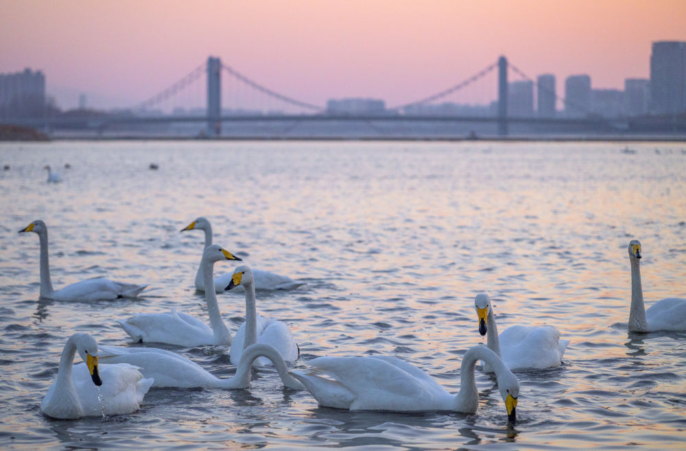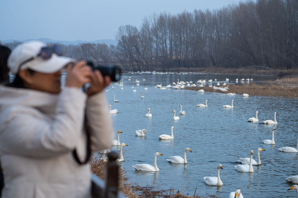 冬季以来,大批天鹅飞临辽宁省朝阳市大凌河栖息越冬,吸引人们前来观赏和拍照。