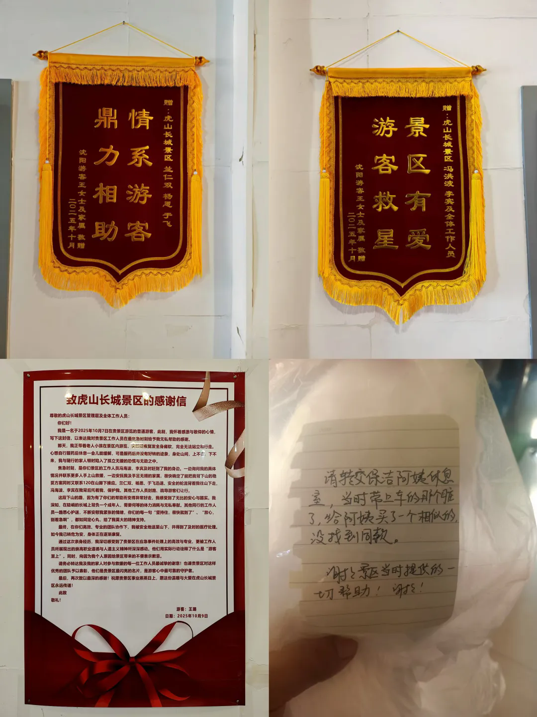 10月13日,虎山长城景区收到了游客王璐女士送来的亲笔感谢信与一面锦旗,字里行间饱含对景区工作人员紧急救援的诚挚谢意,为秋日的景区增添了浓浓暖意。