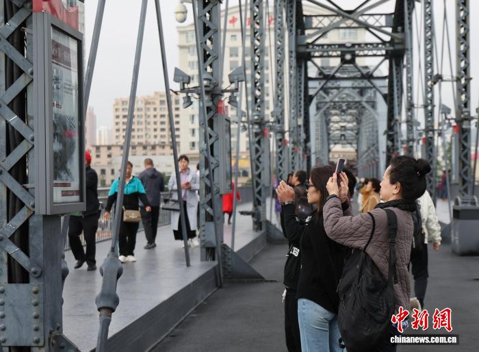 图为丹东鸭绿江断桥吸引游客打卡拍照。中新社记者 于海洋 摄