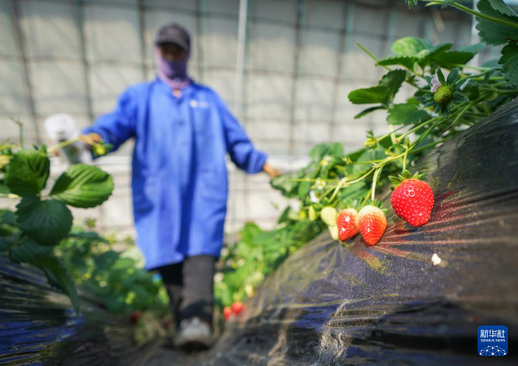 1月12日,在辽宁东港一个草莓大棚内,种植户在采摘草莓。新华社记者 潘昱龙 摄