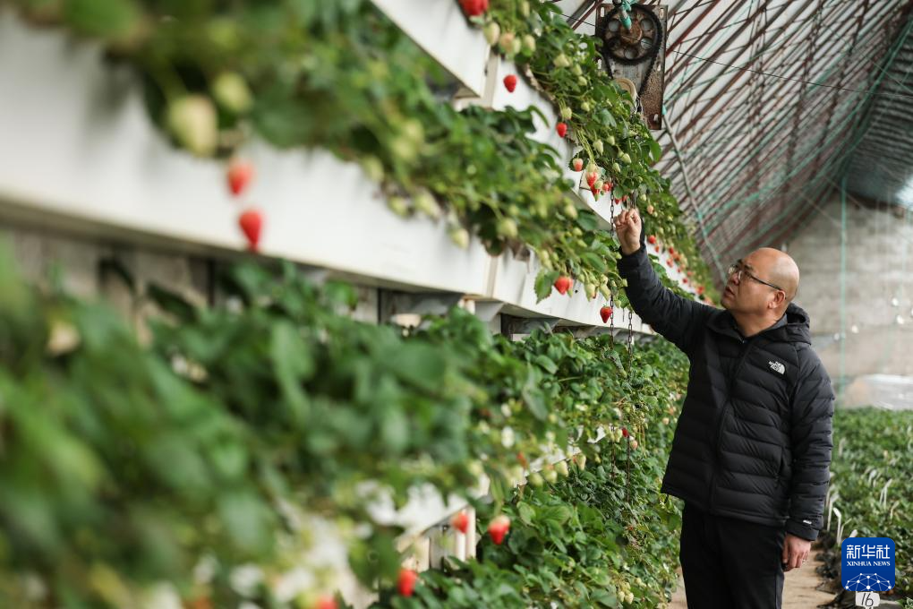 1月12日,在辽宁草莓科学技术研究院,副院长刁玉峰在立体栽培技术展示棚内查看草莓生产苗的生长情况。新华社记者 潘昱龙 摄