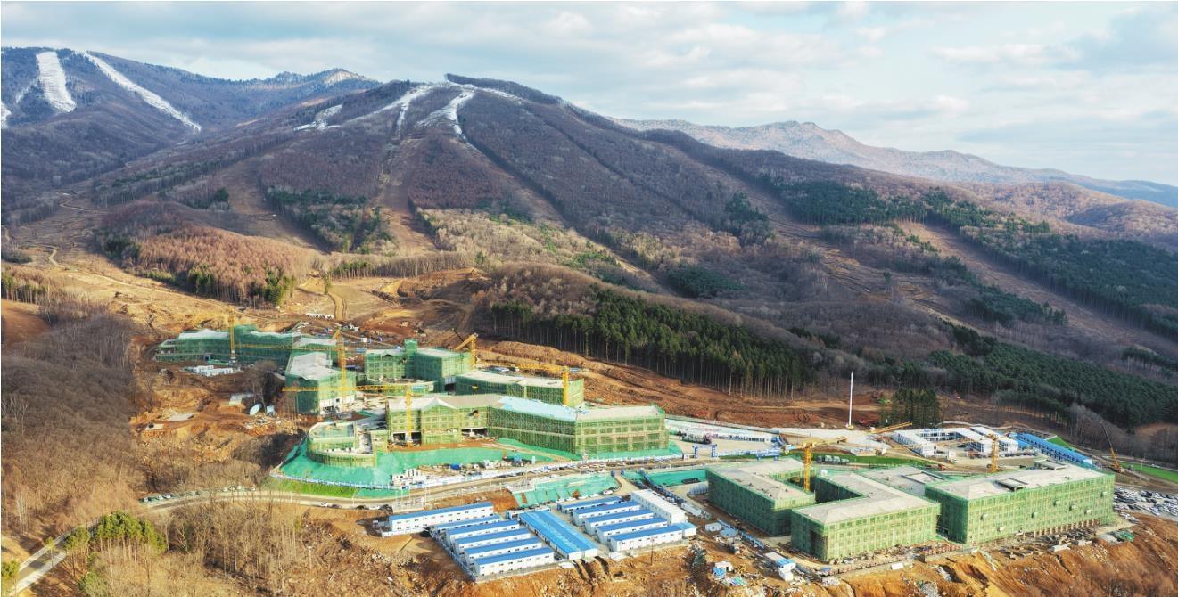 该项目位于新宾满族自治县响水河子乡龙岗山北麓,海拔1373.1米,总规划面积788公顷,包含滑雪场、配套基础设施和岗山水库工程三大子项目。作为2028年第十五届全国冬季运动会雪上项目主场地,抚顺龙岗山雪上运动中心将承办高山滑雪、自由式滑雪等22个小项比赛。目前,抚顺龙岗山雪上运动中心项目运动员村、媒体记者村等工程主体结构已完成封顶,滑雪场雪道工程已完成50%以上。图为运动员村、媒体记者村等工程已进入内部施工阶段。
