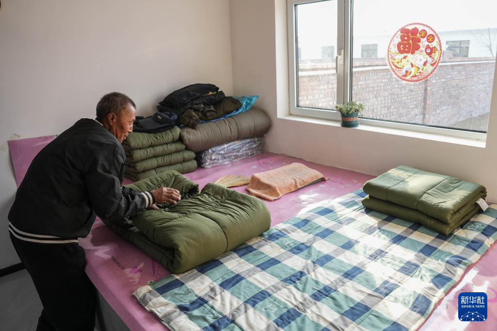 11月8日,辽宁省葫芦岛市绥中县祝家沟村村民在集中安置重建住房内整理被褥。新华社记者 潘昱龙 摄