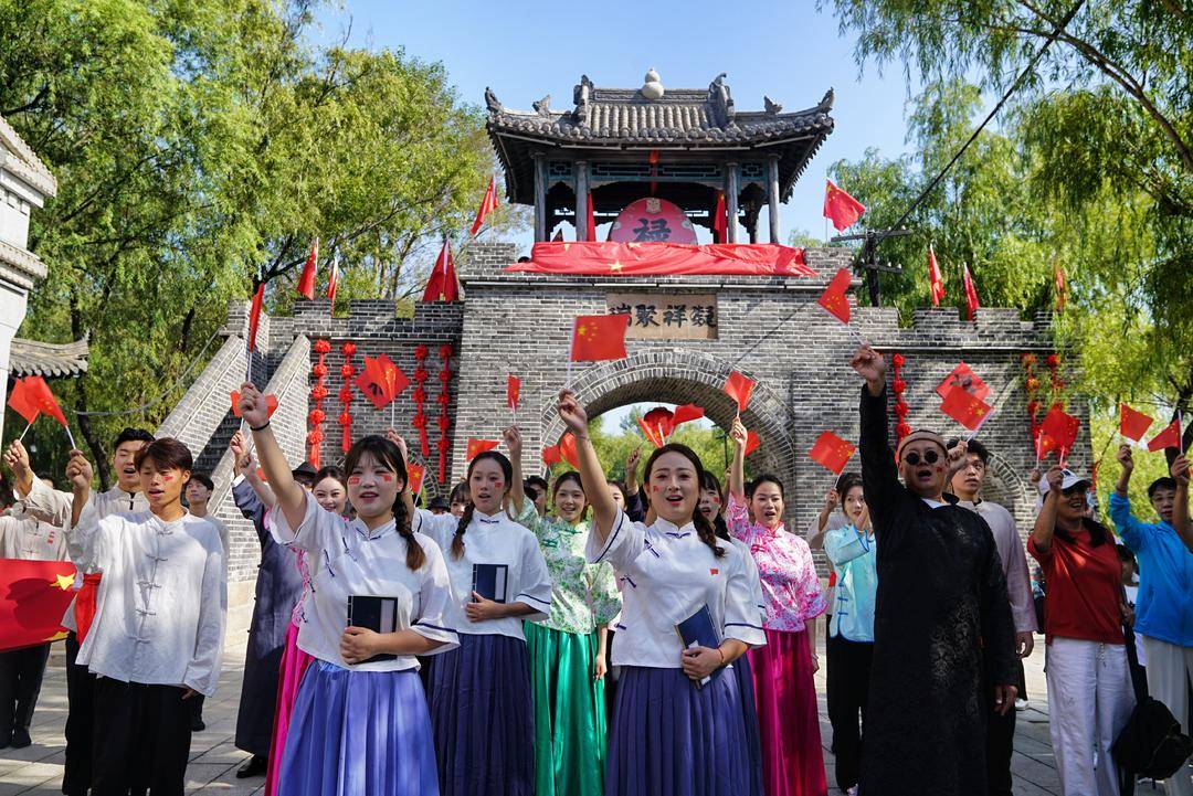 清晨的古镇,烟火气与文化味交织。川剧变脸表演台前,演员转身、甩袖间,脸谱瞬间从绯红切换至墨黑,观众席上“哇”声此起彼伏;丰收地里,家长们带着孩子,看玉米挂满屋檐,用镜头留住秋日美好时光;中心广场上,醒狮腾挪跳跃踩过彩球,“嫦娥”身着襦裙缓缓走出,游客们举起手机合影,沉浸式融入古镇风情。今年,景区还增设了爱国打卡点,在大牌楼、游客中心门口、食坊街等地,“双节同庆”、“盛世华诞”等横幅随处可见,鲜艳的五星红旗与红灯笼相映,节日氛围扑面而来。