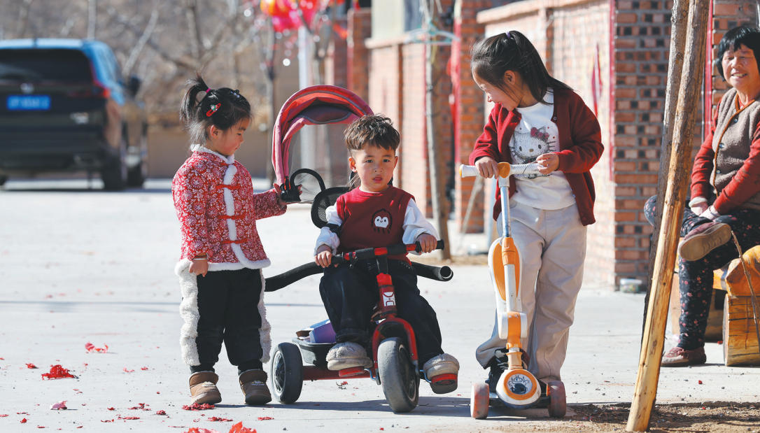 祝家沟村村民查恩英(右)带着孩子在玩耍。 特约记者 田嘉 摄