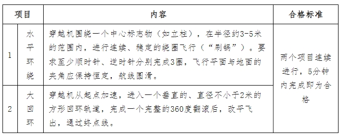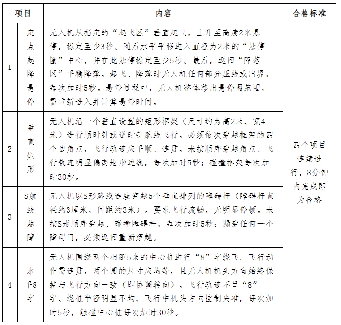 (2)专业科目测试标准:参考中国民用航空局2024年印发的《民用无人驾驶航空器操控员执照考试管理办法》,主要考察应聘人员是否熟练掌握无人机或穿越机起飞、悬停、水平环绕、八字环绕等基础操控技能。具体标准如下: