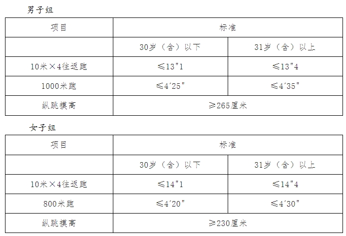备注:年龄计算时间截至到参加体能测试当月。10米×4往返跑每人最多可测2次,男子1000米跑/女子800米跑每人最多可测1次,纵跳摸高最多可测3次。
