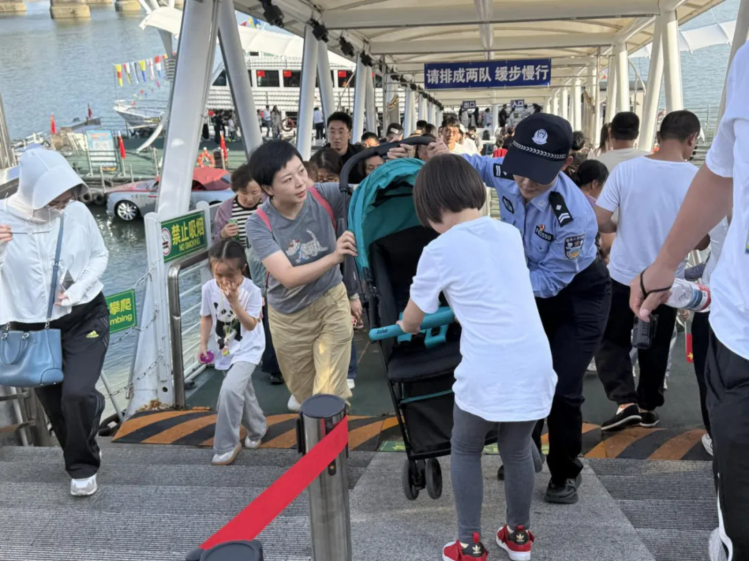 丹东市公安局公交分局航运派出所警力在鸭绿江观光码服务游客民警在码头协助群众搬运物品、维护通行秩序,保障重点区域活动顺畅