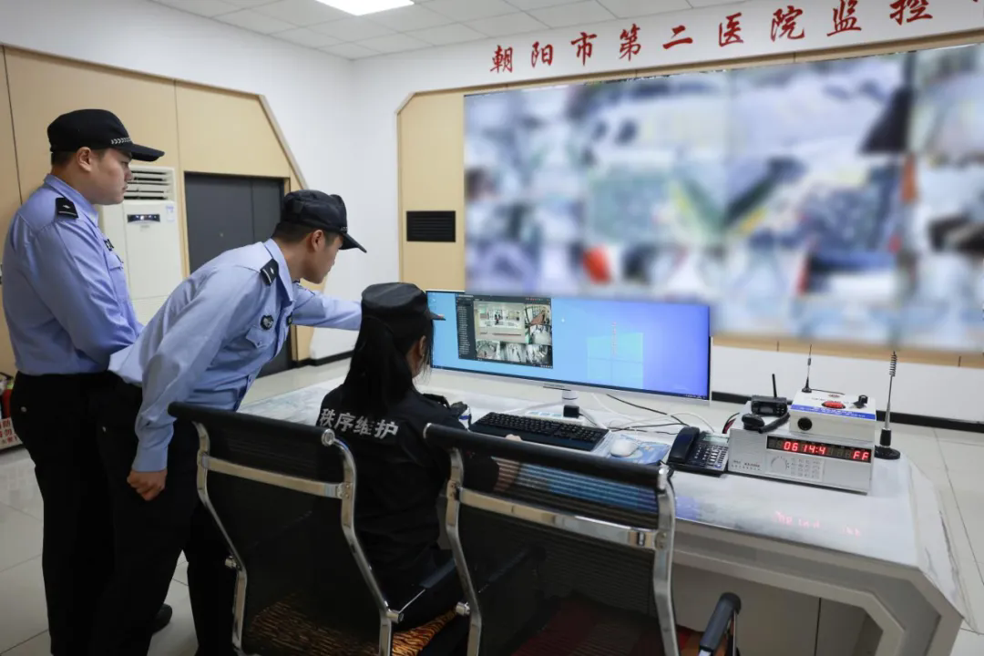 朝阳市公安局民警在第二人民医院查看医院监控,强化大型活动配套重点场所安全管控,为群众参与活动提供全方位保障