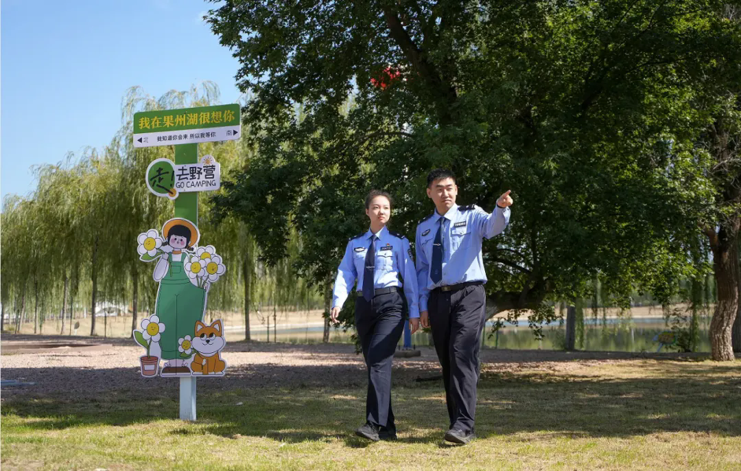 阜新市公安局果州湖露营地执勤民警在果州湖景区巡逻,为游客提供指引等服务,保障景区秩序