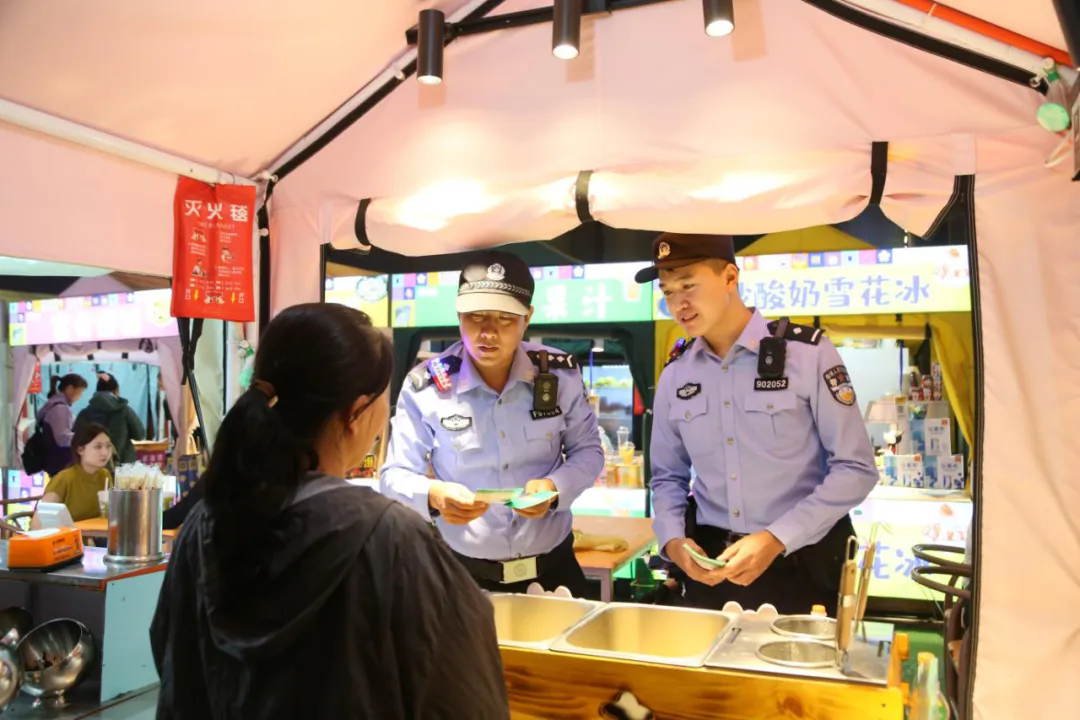 在商圈的摊位集中区域,民警主动与摊主沟通,检查消防安全设备、规范经营摆放,同时提醒摊主注意防范盗窃,保障商户财产安全,为摊位经营营造安全稳定的环境,助力节日消费市场有序发展。