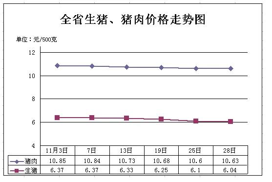 (一)猪肉价格小幅下降。供应上,养殖企业为冲年度目标提前出栏生猪,二次育肥大猪集中上市,再加上进口猪肉和冻肉库存充足,市场猪肉供过于求。需求端偏弱,11月禽肉等替代品价格较低分流了部分猪肉消费,餐饮和家庭采购不多,消化不了过剩供应,猪肉价格随之小幅下降。11月28日,生猪(每500克,下同)平均价格6.04元,月环比下降5.18%,同比下降28.01%;猪肉(去骨后腿肉)10.63元,月环比下降2.03%,同比下降18.79%。