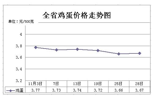 (二)鸡蛋价格小幅下降。供应上,蛋鸡存栏量仍处于近五年高位,老鸡淘汰进度慢,还有冷库蛋库存较多,市场鸡蛋供应充足。需求端正处于淡季,食品厂备货和家庭采购需求减少,餐饮采购量不足,消化不了过剩供应,导致鸡蛋价格小幅下跌。11月28日,鸡蛋平均价格3.67元,月环比下降2.65%,同比下降26.31%。