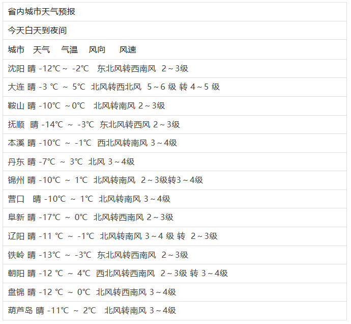 今天气温持续低迷 阜新早间达-17℃ 明天起连续两天升温 周末最高温又跌回零度以下 今年10月,赤道中东太平洋已经进入拉尼娜状态。 根据现阶段国内外数值模式结果来判断, 今年冬季我国气温接近常年同期到偏暖为主, 但是气温阶段性特征明显,冷暖起伏大。 所以凭拉尼娜的一己之力, 不能决定今年冬季的冷暖。 但可以肯定的是, 今年冬季气温的波动幅度会变得更大, 极端冷事件也有出现的可能性。 天气预报 【天气】本周接下来的日子里,气温波动就很大。今天全省依然是晴朗天气为主,但是气温持续低迷。 【气温】阜新预计只有-17度,其他大部分地区-10~-14度之间,大连和丹东-3~-7度。白天辽西地区升温,其他大部分城市降温,升温的城市最高气温基本都在0~4度之间,而降温的城市最高气温仍在零度以下,-1~-3度为主。 【风力】各地西南风3~4级左右,大连4~5级。大家出行调整好着装。 【未来一周】周四和周五全省要迎来集体升温,最高气温将升至4~10度,特别是周五,多地都在6度以上,大连最暖可以达到10度。但是周五也会迎来一次降水过程,从目前的预报看,降水量不大,抚顺有雨夹雪,本溪丹东阵雨,其他城市多云天气为主。南风4级上下。周五虽然气温高,但是天气条件不那么理想,体感有点凉,大家还是要以保暖为主。周六,新一轮冷空气抵达辽宁,届时,中东部地区气温将下降6℃~8℃,局部8℃~10℃,其他地区下降4℃~6℃,最高气温重新跌回0度以下,我们再次回归严寒行列。而且本周日是冬至,随后一年中最冷的“三九天”也就要来了。从目前的预报看,下周一可能还有雪,都市气象站将密切关注。 (新北方)