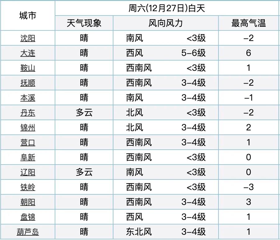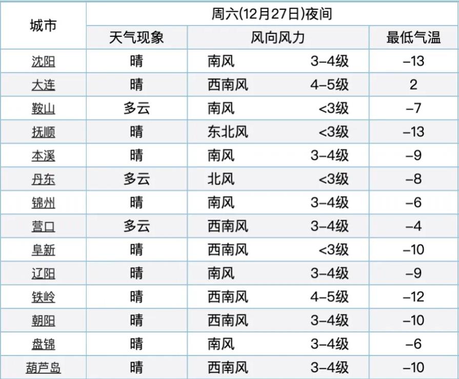 26日8时到27日8时,全省晴有时多云;最低气温西丰零下31℃到零下27℃,沈阳、抚顺、本溪地区和沈抚示范区及铁岭市区、昌图、开原零下26℃到零下21℃,大连、锦州、营口、盘锦地区零下14℃到零下9℃,其他地区零下20℃到零下15℃;最高气温大连地区0℃到3℃,锦州、营口、朝阳、葫芦岛地区零下6℃到零下1℃,其他地区零下12℃到零下7℃。27日8时到28日8时,全省晴有时多云。