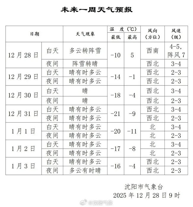 据沈阳市气象台预报