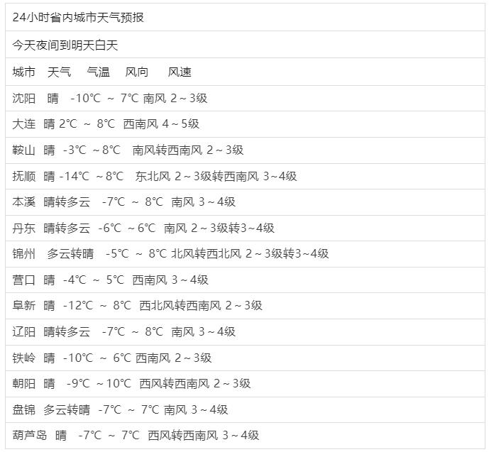 明天省内整体阳光还是很充足的,辽宁东部地区云层要偏厚一点,会转为多云。而省内将会再次开启升温通道,明天白天全省气温会在今天的基础上升高1-5℃,升温效果显著,最高温都在5℃及以上,5-8℃,其中大多都能达到7-8℃,朝阳预计会率先达到10℃。早间的气温也有升高,比如大连最低温已经可以升高2℃,全天气温都达到零上了,不过沈阳、抚顺、阜新、铁岭最低温还是在-14至-10℃,温度还是偏低一些的,要注意保暖,其他城市在-9至-3℃,同时,明天省内的风也不大,全省以南风为主,风力多在3-4级,大连5级,整体来看,明天的天气会转暖不少。