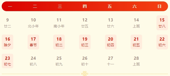 2月15日(腊月廿八)0时至2月23日(正月初七)24时,共9天。