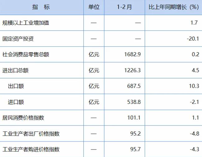 1-2月份,全省社会消费品零售总额1682.9亿元,同比增长0.2%。