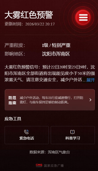 浑南区气象台2026年03月22日20时12分发布大雾红色预警信号: