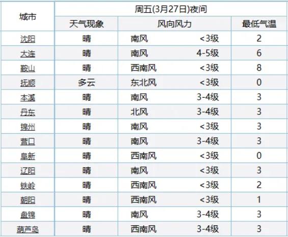 26日10时到27日8时,全省多云转晴;最高气温大连、营口、葫芦岛地区14℃到17℃,其他地区18℃到23℃;最低气温大连、鞍山、锦州、盘锦地区4℃到7℃,其他地区零下2℃到3℃。