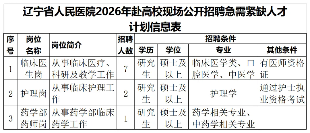 报名方式:本次招聘采取网上报名及现场报名两种方式。网上报名人员请于2026年4月13日9:00至17日17:00间将《辽宁省人民医院2026年赴高校现场公开招聘急需紧缺人才报名登记表》并将简历及其他证明材料发至邮箱,邮件命名方式:报考岗位+姓名(以电子邮件接收时间为准,逾期作废)。邮箱:24016568@163.com
