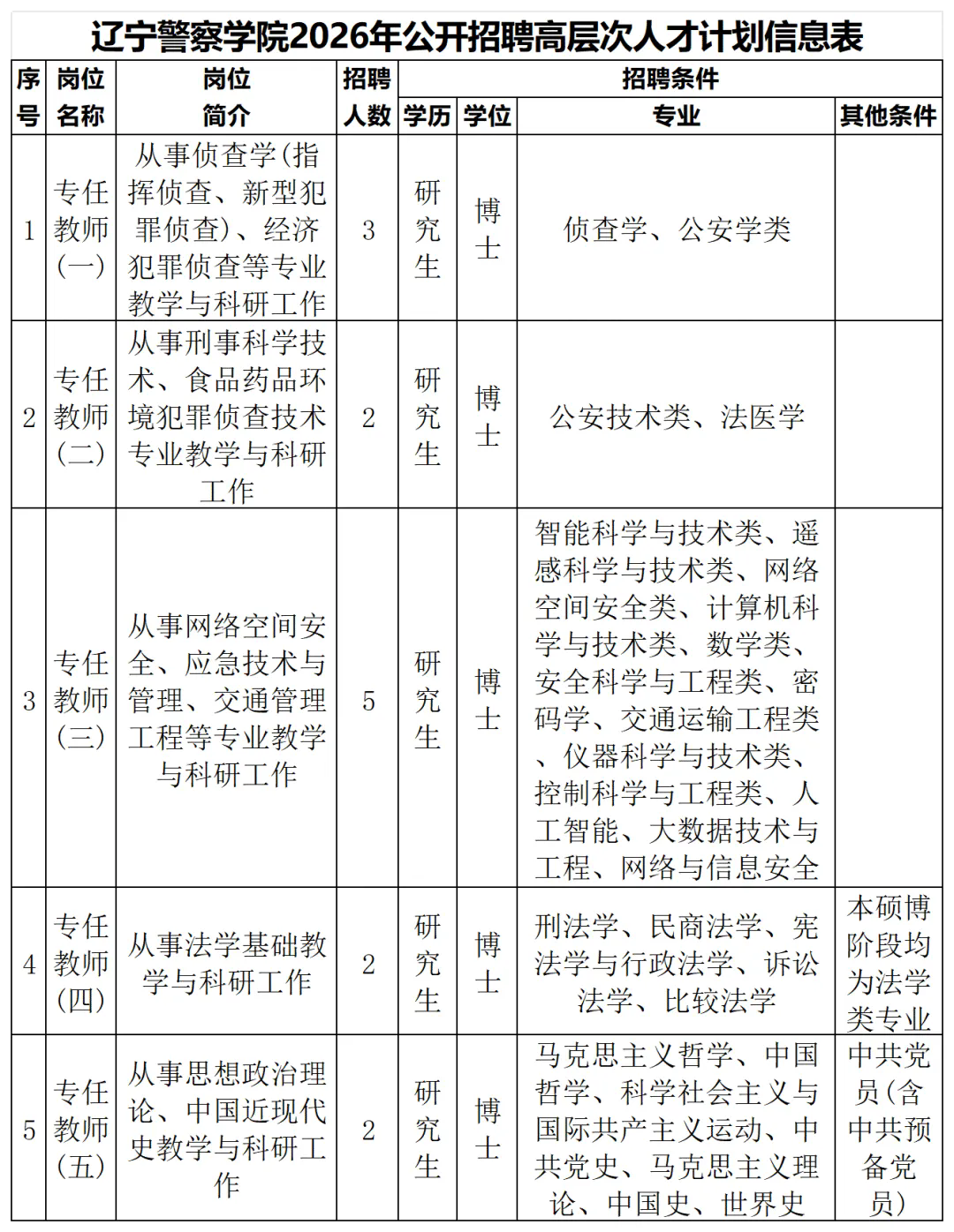 报名方式:网上报名。请认真阅读本公告和计划信息表,选择符合自身条件的岗位进行报名,每人只能报考一个岗位。符合招聘条件的应聘人员需下载填写《辽宁警察学院应聘人员登记表》及《辽宁警察学院应聘人员汇总表》,于报名截止日前发送至邮箱进行报名,要求邮件主题均为“姓名+所报岗位”。邮箱:lnpcgkzp@163.com