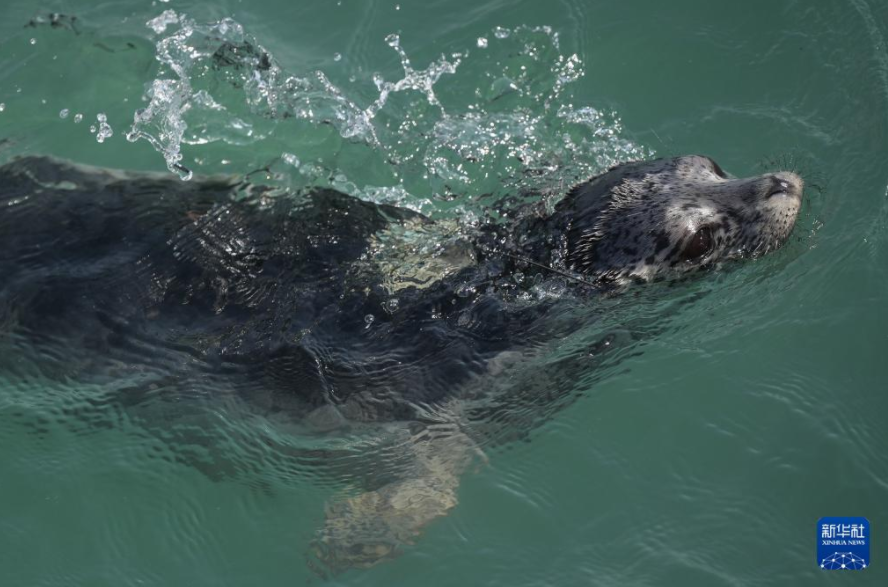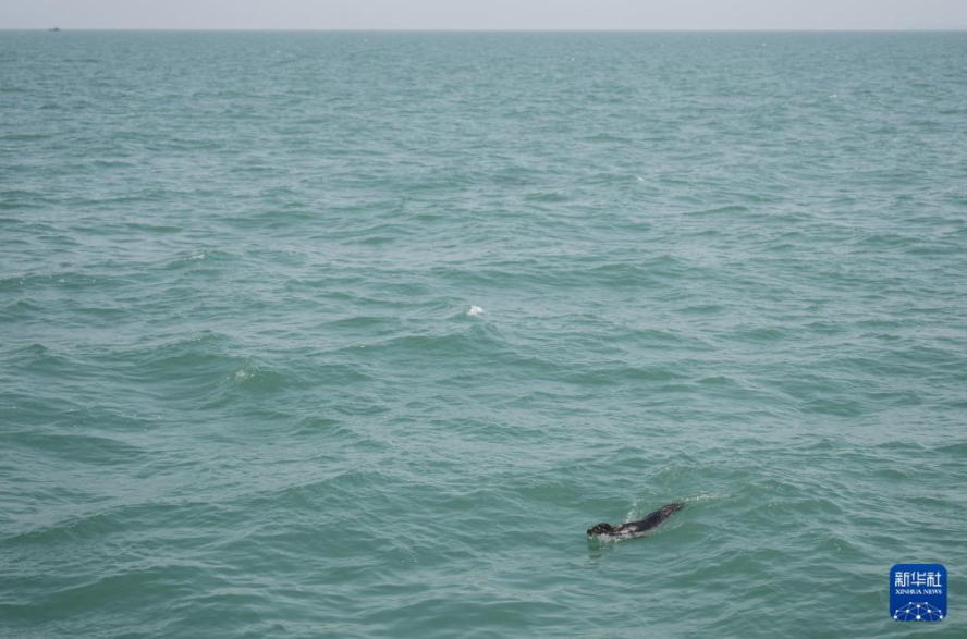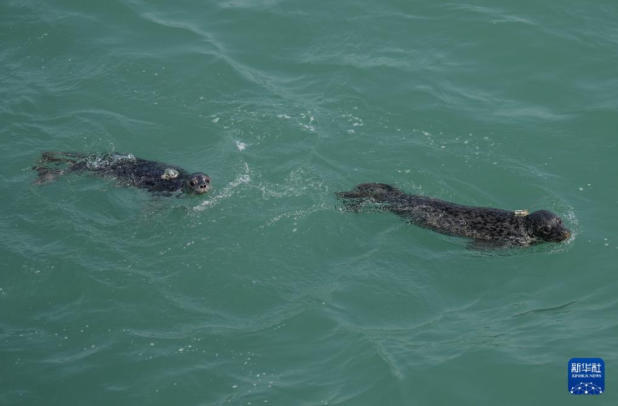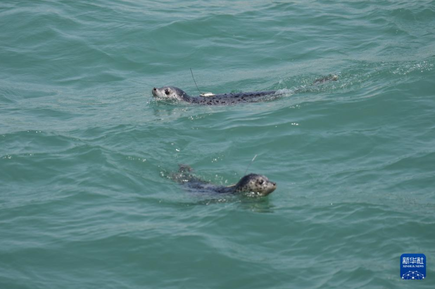 4月16日,被放归的西太平洋斑海豹在大连市旅顺口区附近海域活动。
