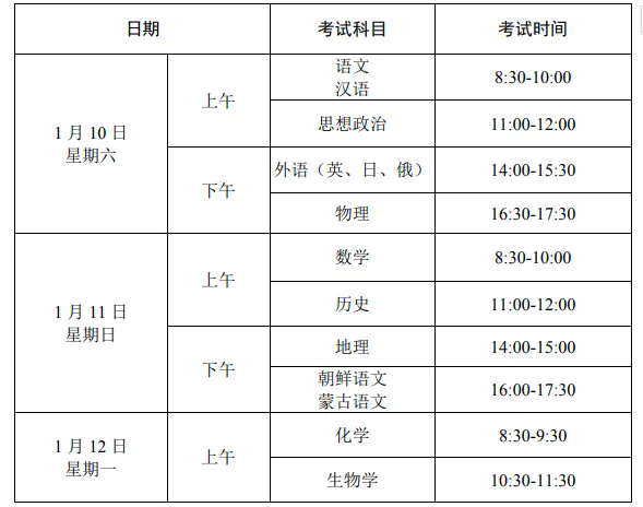 本次学业水平考试科目包括:语文(含民族语文、汉语)、数学、外语(含英、日、俄)、思想政治、历史、地理、物理、化学、生物学共9科;普通高中二年级在籍学生新开考语文、数学、外语(含英、日、俄)、思想政治和物理5个考试科目。