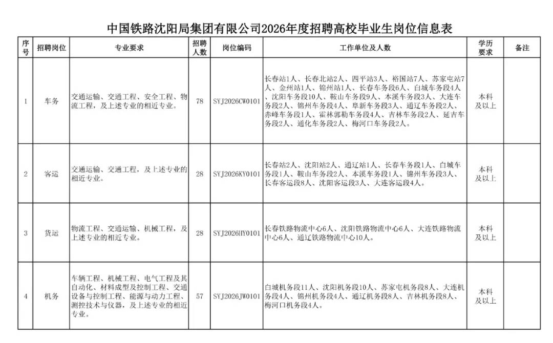 中国铁路沈阳局集团有限公司2026年度招聘高校毕业生公告(一)