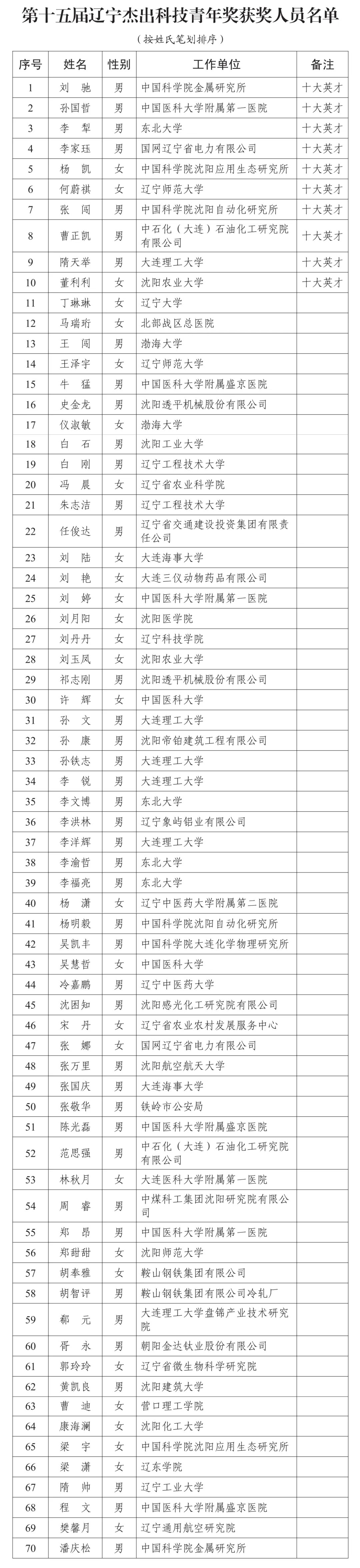 近年来,全省广大青年科技工作者以习近平新时代中国特色社会主义思想为指导,在我省经济发展、社会进步和科技创新中作出突出贡献。为进一步贯彻落实中央和省委人才工作会议精神,培养造就一批青年科技拔尖人才,激发全省青年科技工作者的科技创新热情,树立青年科技人才科技创新典范,经辽宁杰出科技青年奖评审委员会组织评审、辽宁杰出科技青年奖评选表彰工作专班审定,省委组织部、省人力资源社会保障厅、省科技厅、团省委、省科协决定授予丁琳琳等70名同志第十五届辽宁杰出科技青年奖,其中刘驰等10名同志为第十五届辽宁杰出科技青年奖十大英才。
