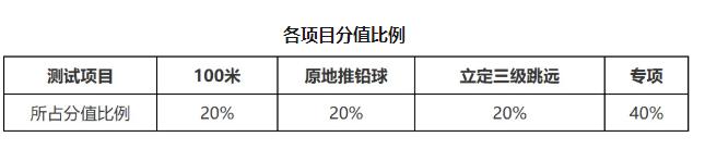 身体素质考试项目:100米、原地推铅球和立定三级跳远三项。
