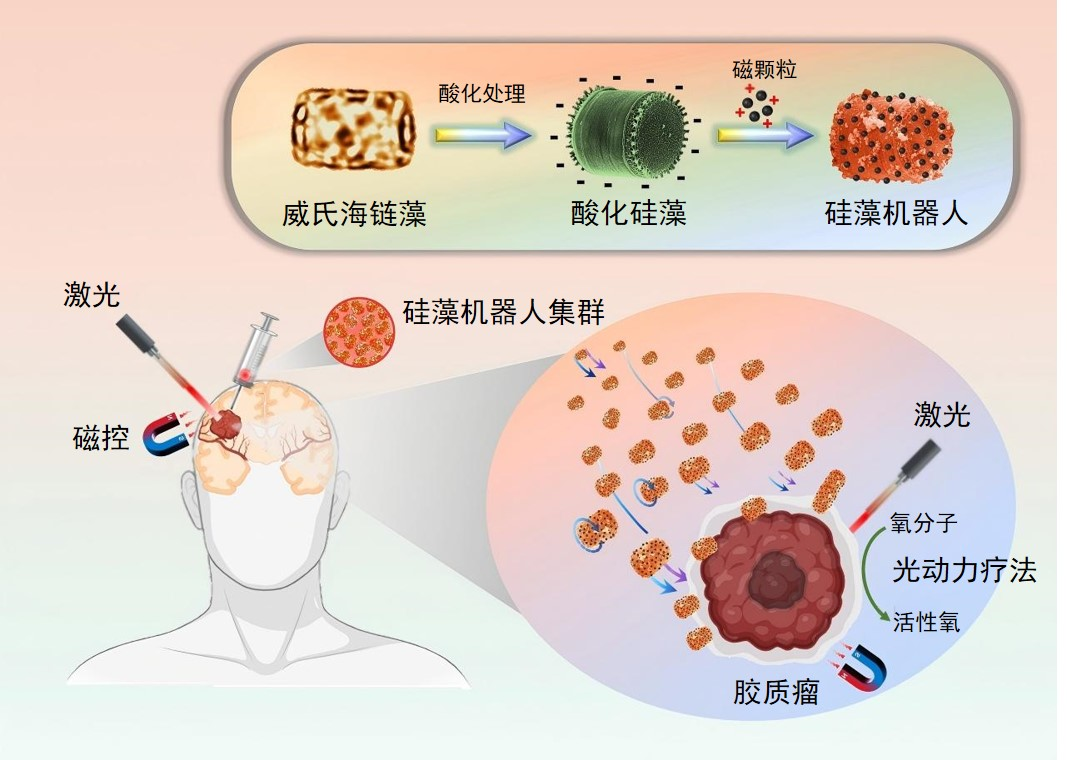 近日,中国科学院沈阳自动化所机器人学研究室科研团队联合中国医科大学附属盛京医院,开发了一种面向脑胶质瘤治疗的硅藻微米机器人,它具有良好的磁响应特性与可编程运动能力,能够精准地靶向运动到胶质瘤病灶区域,还可以直接利用体内的内源性叶绿素作为光敏剂,在不额外修饰药物的情况下,实现针对胶质母细胞瘤的光动力治疗。动物实验表明,采用的硅藻机器人对原代胶质瘤细胞产生了显著的杀伤效果,且具有良好的生物相容性。