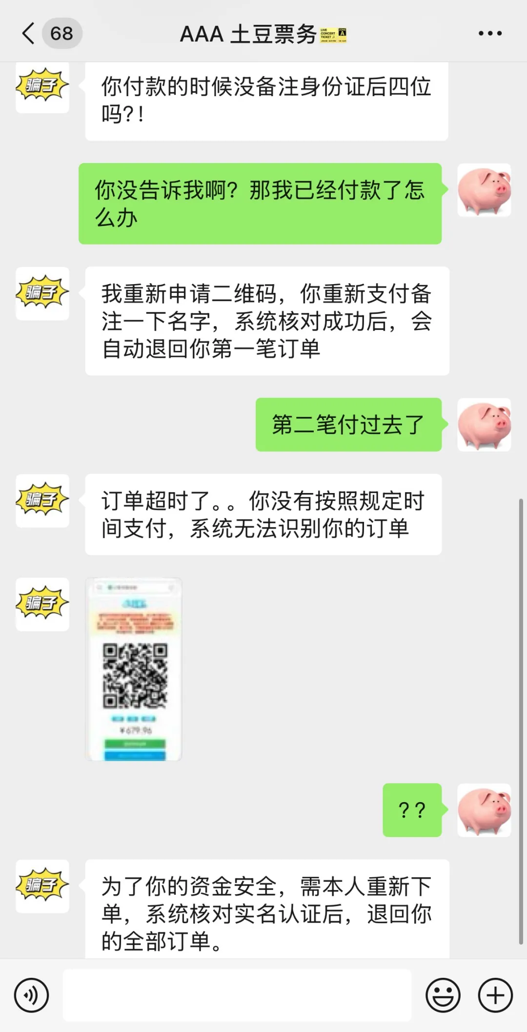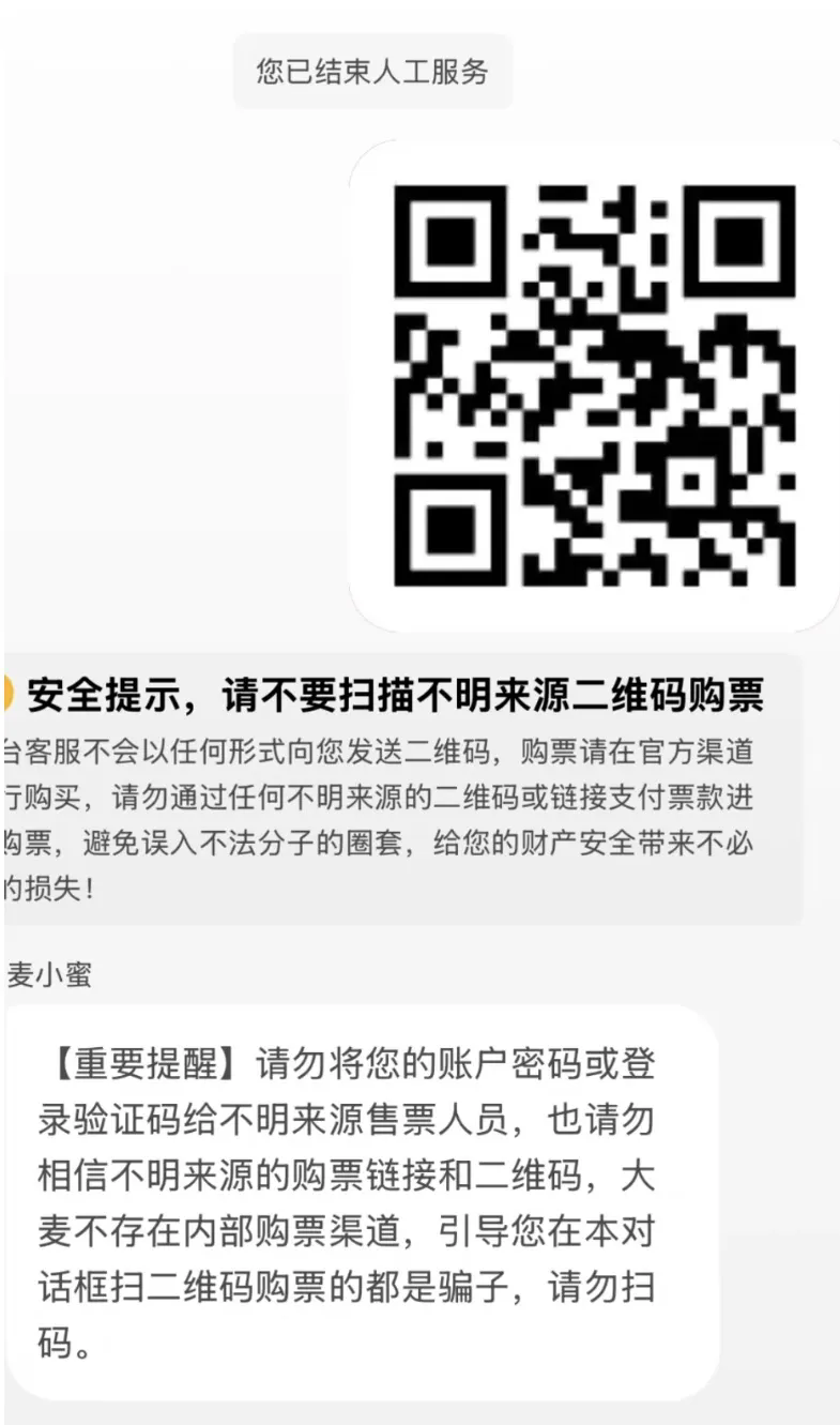 骗子冒充“大麦内部人员”,以有“预留票”为由,索要受害者手机号和验证码,实则登录其账号,在官方聊天界面伪造带大麦商标的付款二维码。