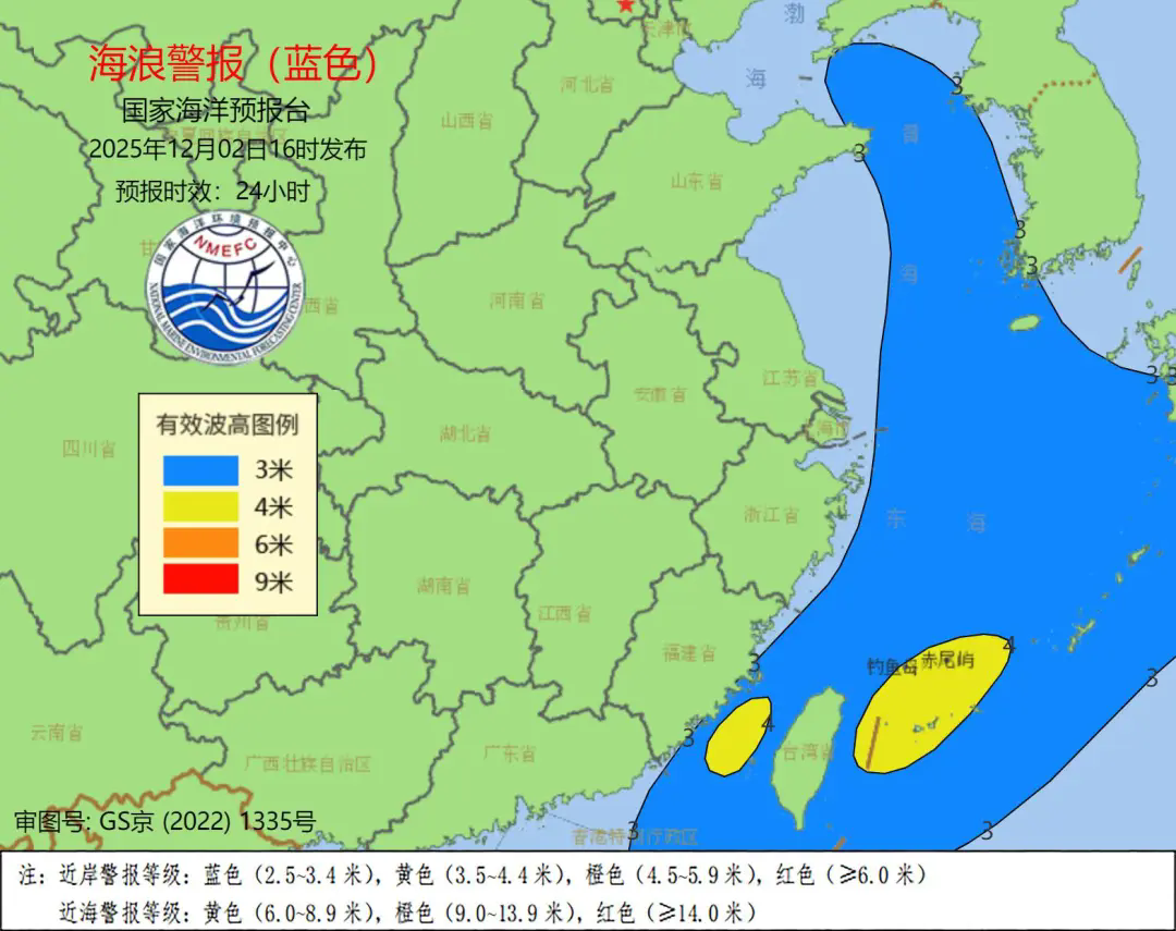 辽宁省海洋预警监测中心12月2日16时发布海浪Ⅳ级蓝色警报。