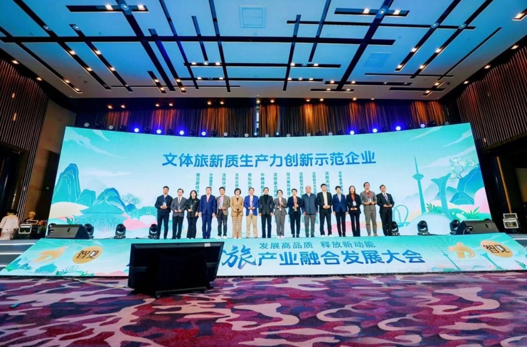 会议现场,智见新经济产业集团、中国建筑东北设计研究院有限公司、沈阳华润万象城、沈阳云锦视界智能科技有限公司、君弘兆业文化科技产业集团、中腾领航文化发展有限公司、沈阳盘古网络技术有限公司、冠珹餐饮管理(沈阳)有限公司、沈阳和平好乐科技文化有限公司、沈阳和平文化旅游产业发展有限公司、沈阳天枢科技有限公司、沈阳奥美体育文化传播有限公司获得了“文体旅新质生产力创新示范企业”殊荣。