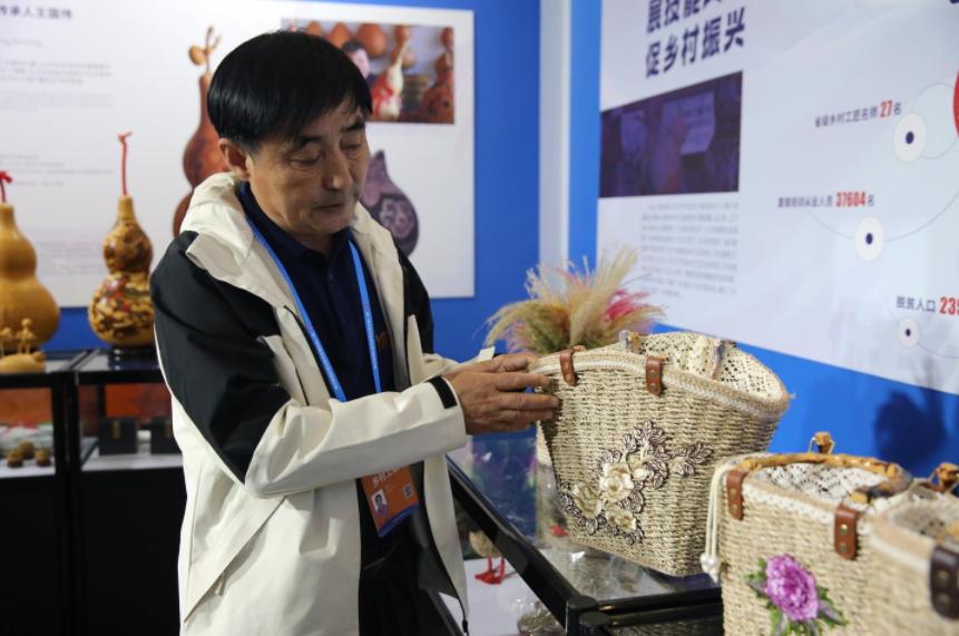 此次展会,辽宁省乡村工匠名师唐恒带来了苇编工艺品。从简单的草鞋、草帽,到复杂的手拎包、米箱,每一件作品都充满了乡村的质朴与生活的智慧。
