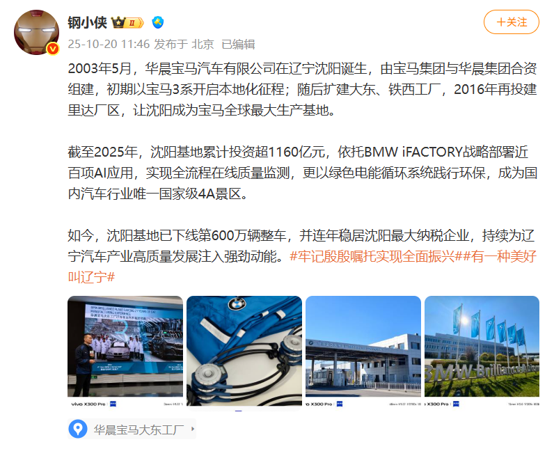网络名人@钢小侠表示,“沈阳基地已下线第600万辆整车,并连年稳居沈阳最大纳税企业,持续为辽宁汽车产业高质量发展注入强劲动能。”