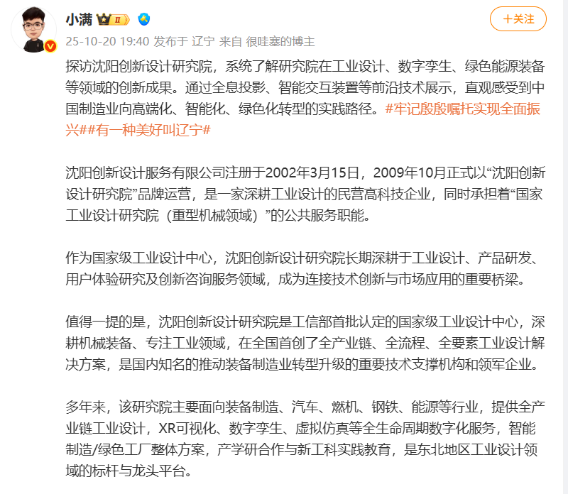 网络名人@小满表示,“探访沈阳创新设计研究院,系统了解研究院在工业设计、数字孪生、绿色能源装备等领域的创新成果。通过全息投影、智能交互装置等前沿技术展示,直观感受到中国制造业向高端化、智能化、绿色化转型的实践路径。”