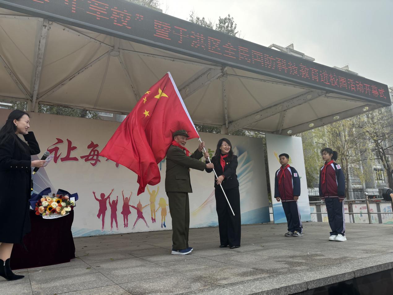 活动现场的气氛,在国旗传递环节推向高潮。抗美援朝老英雄李维波怀着对祖国下一代的殷切期望,迈着沉稳的步伐走上台致词并郑重地将一面鲜艳的国旗传递给校领导及学生代表。这一庄重的交接仪式,不仅是一面旗帜的传递,更是国防精神的传承,是老一辈革命先辈的爱国情怀与责任担当向新一代青少年的接力,承载着对青少年赓续红色血脉、勇担国防重任的深切嘱托。