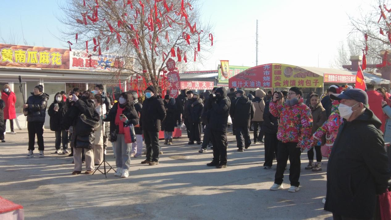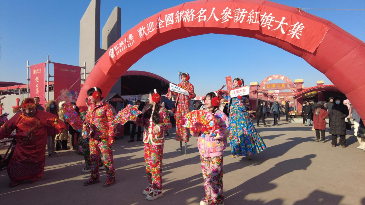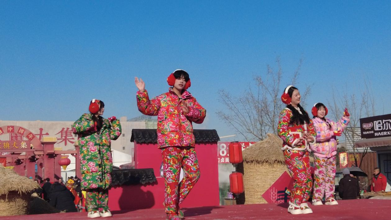 与非遗民俗交融是红旗大集的另一亮点,逛集体验更具文化厚度。1月24至25日,红旗大集举行“一起逛大集・大过中国年”腊八主题活动,串联起非遗展演、传统游戏、书法送福等丰富内容,为游客打造出沉浸式年俗场景体验。“福粥暖冬·文脉传承”仪式区内,传统粮仓、斗升为造型的艺术装置呈现出“春种秋收、冬藏纳福”的农耕意象,成为游客驻足观看与拍照打卡点。古法柴火锅持续熬煮腊八粥,在“开锅纳福”仪式后,工作人员向市民与游客免费分发。东北大鼓、糖画、剪纸、铝编、葫芦烙画、皮影等非遗项目轮番展演,游客可在非遗文创体验区里亲手体验非遗制作,参与趣味民俗活动,近距离感受传统手工艺的匠心之美。