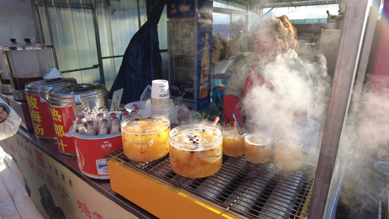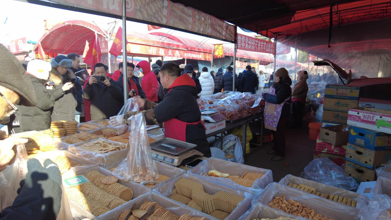 冰雪为底、红火点缀,摊位升腾的热气与积雪相映,空气中透着冬日的清冽与食物暖香。作为2024年中国旅游研究院“美食旅游融合创新发展案例”,红旗大集沉浸式美食街区汇集了丰富地道的辽味美食:游客可来此品尝鲜香的羊汤、外酥里嫩的煎鲅鱼、金黄软糯的粘豆包,也可以在冻货区体验冻梨、冻黄桃、冻豆腐等特色,感受“腊八吃冰”的民俗传统。其中“大集羊汤”“大集麻辣烫”等本土风味已发展为具有代表性的小吃品牌。集市里,“饼干小哥”招呼着“来一个尝尝,别不好意思,来来来”、打糕摊位“八十一锤”的吆喝声、糖葫芦小哥富有感染力的歌声,这种“一摊一景”的独特布局,打造出可观可品、可互动的沉浸式场景,成功点燃冬日消费热情,勾勒出生动的民俗赶集画面。冰雪装点百年集市,热情蒸腾人间烟火,红旗大集正以地道的美食和热情的招待欢迎各地游客来品尝、来感受。